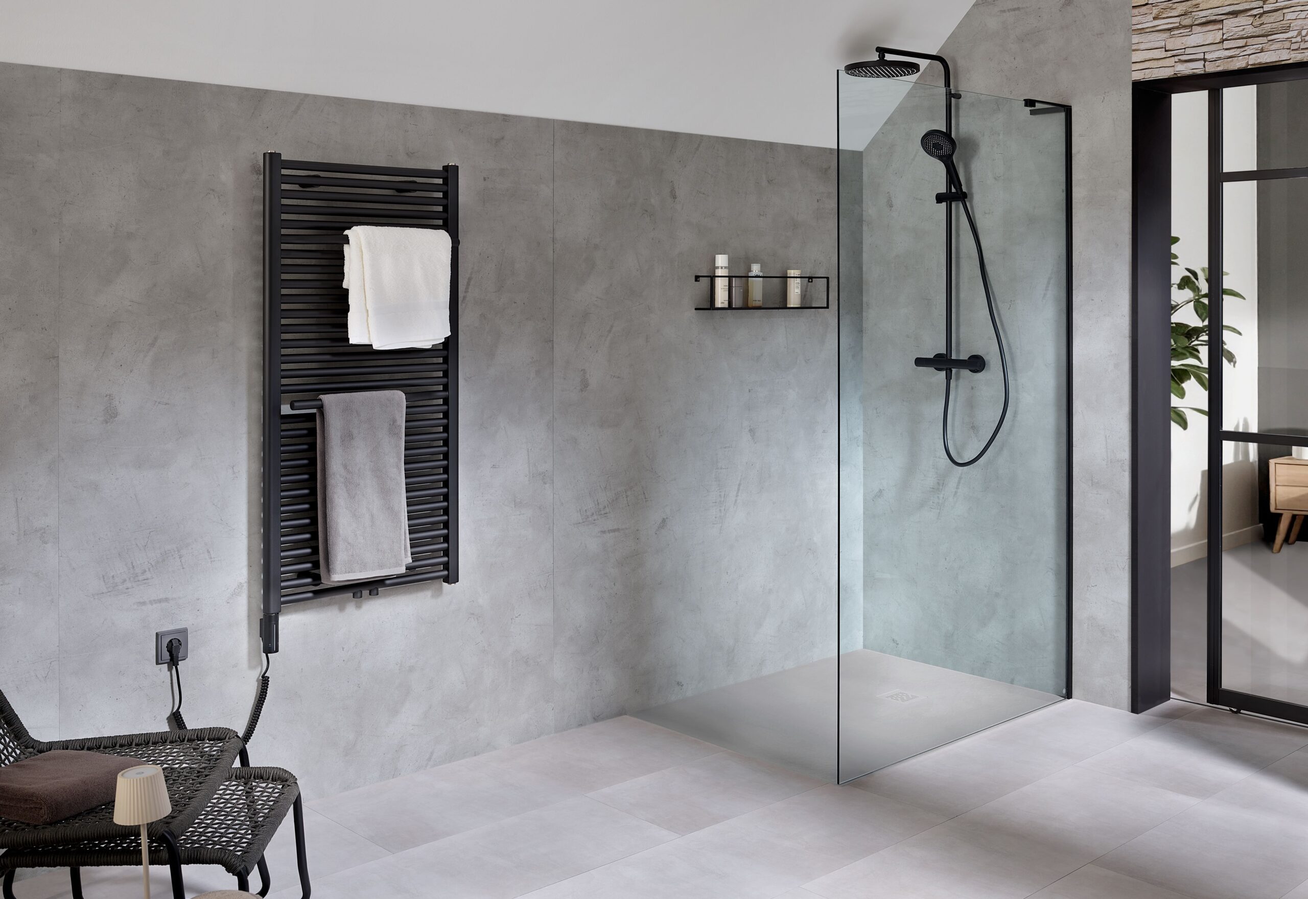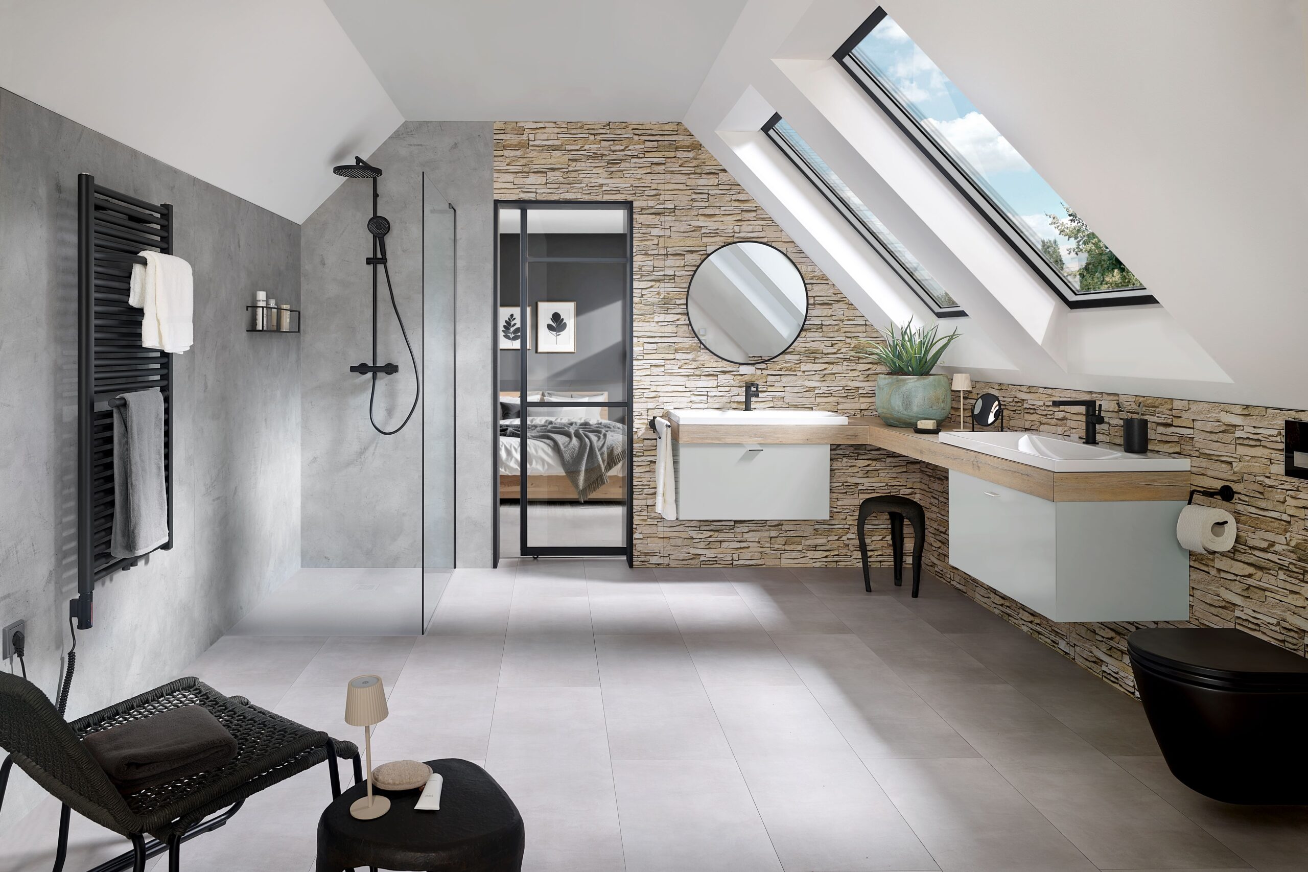 Die ersten Sonnenstrahlen fallen durch die klaren, schräg angesetzten Fenster auf die naturbelassene Steinwand. Das warme Holz, der kühle Stein, die Eleganz von mattem Schwarz, alles fügt sich zu einem Gesamterlebnis, das zur Ruhe führt. Im Zentrum steht die offen gestaltete und bodengleiche Dusche mit dem Walk In Pro Frontelement des Herstellers HSK. Das filigrane Echtglas wirkt wie eine unsichtbare Grenze zwischen Alltag und Auszeit. Frei von störenden Linien entsteht ein Gefühl der Weite, als würde die Dusche den Raum umarmen und neue Leichtigkeit schenken. Unter den Füßen, die samtige Marmor-Polymer Duschwanne Apunto. Angenehm warm, rutschhemmend und sinnlich in der Berührung. Das Wasser fließt zum Punktablauf der farblich integriert ist.