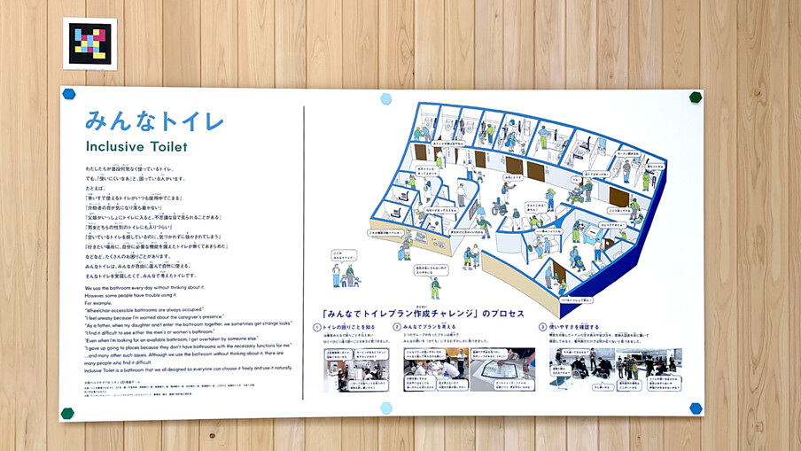 Detailansicht der Hinweistafel zur inklusiven Toilette im Osaka Healthcare Pavilion: Die Informationen erklären die einzelnen Funktionen und verdeutlichen den Anspruch, Sanitärräume für Menschen mit unterschiedlichen Bedürfnissen verständlich und zugänglich zu gestalten. (Foto: TOTO)