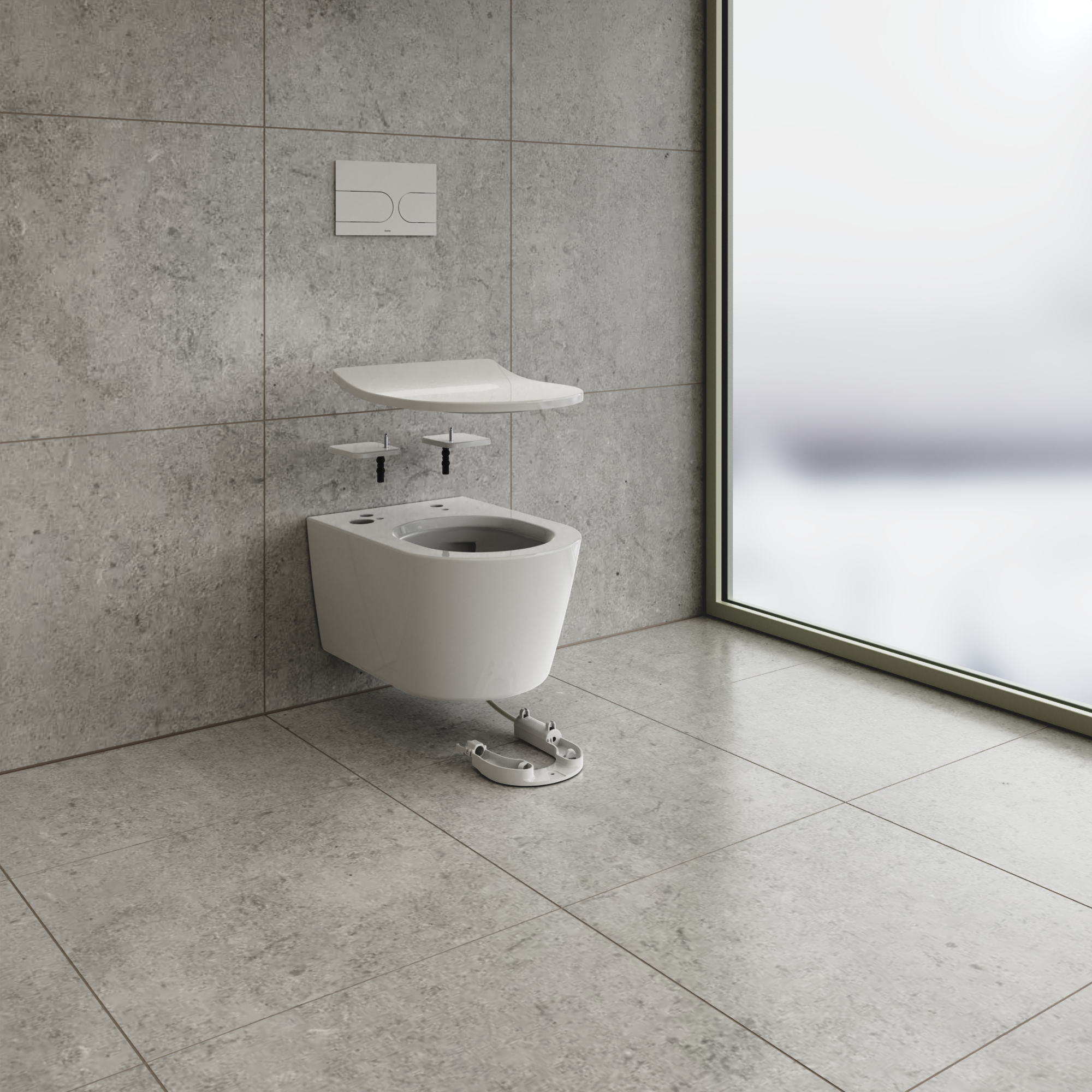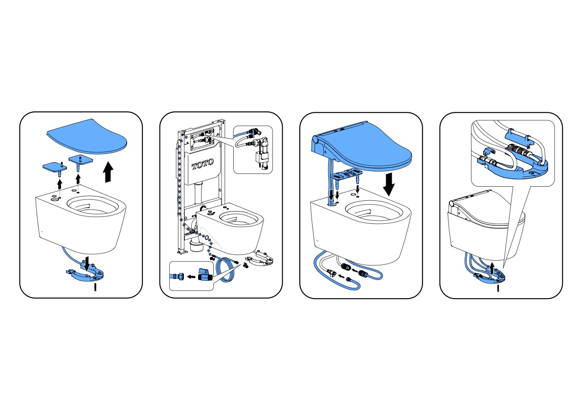 Bei den für ein Upgrade vorgesehenen WC-Modellen sind die Installationsöffnungen für Wasser und Strom bereits vorhanden. Solange die Keramiken als WC mit einem normalen WC-Deckel genutzt werden, sind die notwendigen Löcher in der Keramik mit unauffälligen FlexCovern abgedeckt. Wird das WC dann zum WASHLET umgewandelt, lassen sich die FlexCover entfernen, das WASHLET auf die Keramik setzen und der Wasser- und Stromanschluss durch die Öffnungen führen. Besonders schnell und bequem lässt sich das Upgrade durchführen, wenn der Installationsrahmen von TOTO verwendet wird. In diesem Fall muss das WC nicht von der Wand genommen werden, um das Upgrade durchzuführen. Grundsätzlich funktionieren beim Upgrade auch die Installationsrahmen anderer Hersteller. Mit einem TOTO Installationsrahmen gelingt das Aufrüsten mit etwas Übung jedoch bereits in fünf Minuten.